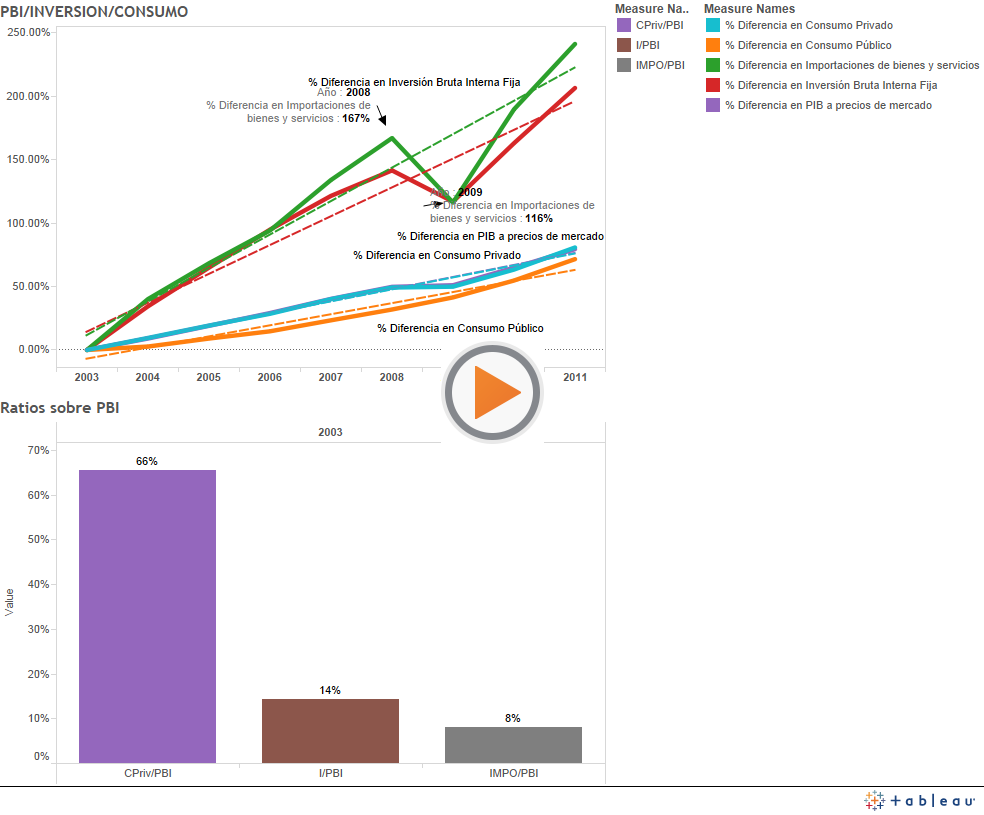 La lógica de este diagrama es contar que el PBI creció a casi igual ritmo que el consumo, mientras que la inversión se vio ligada fuertemente a las importaciones que tuvieron un impacto con la crisis de las subprimes en el hemisferio norte en el 2009.